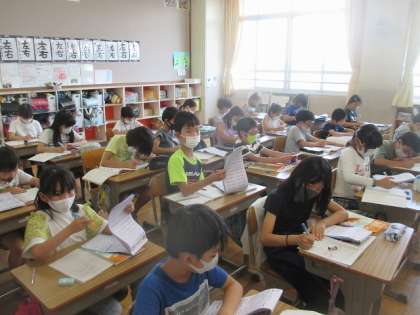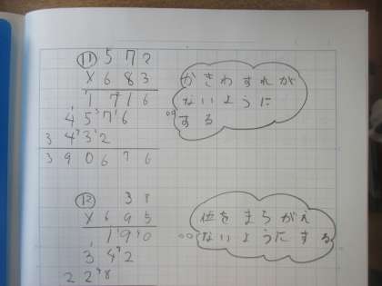 算数「1億をこえる数」の単元のまとめとして,これまで取り組んだ問題の復習をしました。まずはそれぞれの目標をたてました。「○点以上とりたい!」「前の点数をこえたい。」など1人1人ちがいます。その目標に向かって計算ドリルや教科書の問題を解きました。わからないことは何回質問にきてもOKと伝えています。自分でどんどん進める子。質問しながら取り組む子。いろいろな子がいます。問題を解いたら分析をしました。「自分ができることはこれ。でも苦手なのは…。」と自分の苦手なところを明らかにしました。最後に苦手なところや間違えたところを練習します。ポイントは1人でできるかどうか。できた子は満足そうでした。できなかった子はできるまで質問したり苦手な問題を解いたりしています。