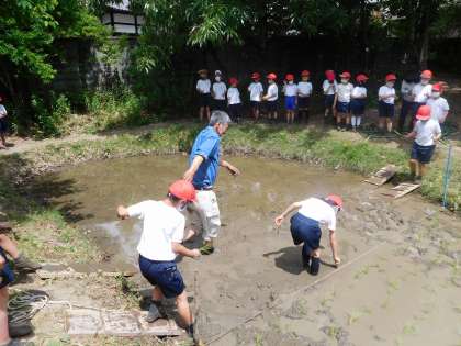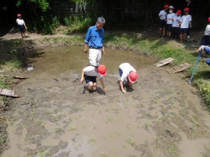 地域のお米の先生や農協の方々に来ていただき,ゆめの森の田んぼで田植えをしました。初めて田植えを経験する子も多く,今日の日を楽しみにしてました。苗の根をもって土の奥まで深く植えることを教えていただき,田植えに挑戦しました。子どもたちからは,「1株から何粒ぐらいお米ができるのだろう。」「お米を育てるポイントはなんだろう。」といった疑問がたくさん出ていました。田んぼの水を切らせないように気を付けて育てていきたいと思います。