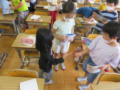 物の数をたずねたり,伝え合う活動をしました。写真は,ジャンケンを英語でしている様子です。友達どうしで,元気よく「ロック,シザーズ,ペーパー,1,2,3!!」と対戦する姿は,ほほえましいですね。最後に「何回勝てましたか」と聞いてみる場面もありました。