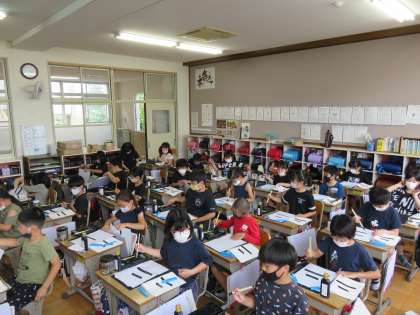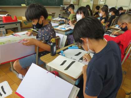 前回の練習をもとに,漢数字の「二」に挑戦しました。3回練習し,3枚の半紙に清書をしました。始筆・送筆・終筆に気をつけて書きました。片づけや準備も慣れて,早く正確にできるといいですね。
