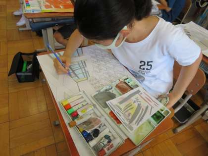 図画工作科の学習で学校のお気に入りの風景を描いています。今回の学習では,様々な透視法を使った構図で影を意識しながら描いています。GIGA端末を使って写真をじっくりと見ながら,細部までこだわって学習に取り組んでいます。完成をお楽しみに!