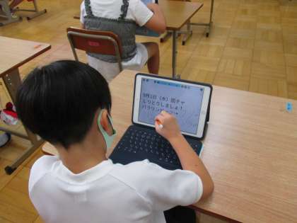 タッチペンが使いやすい子,指で書く方が良い子,ローマ字入力をがんばる子,音声入力を楽しむ子,それぞれがやりやすいやり方で,入力をしたり発表をしたりしています。