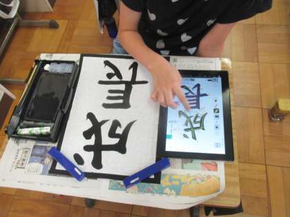 書写の学習では,デジタル教科書を使って,気を付ける所を共有しました。
