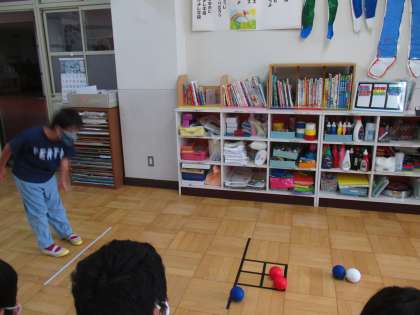 ボッチャのルールを確認して発表の練習をしたり,ジャックボールに近づけるために練習したりしました。