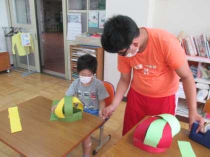 チームに分かれて,画用紙を使っての帽子作りをしています。上級生が下級生に作り方を伝えながら進めています。