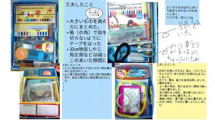 お道具箱が使いやすいように箱を使ったり,厚紙を使ったりして区切ったり,よく使うものをお道具箱の手前に置いたりしている工夫をしていました。