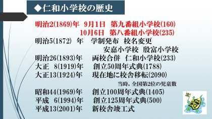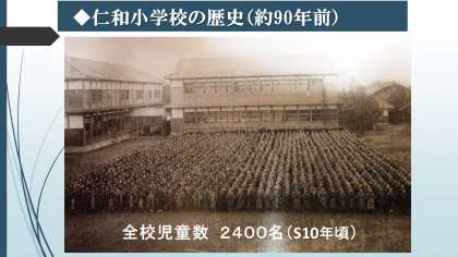 仁和小学校は,第八・第九番組小学校として開設され,のちに仁和小学校となったこと,一番多い時期には(昭和10年頃),2400人の児童がこの仁和小学校で学んでいたことなどを知りました。これからも,仁和小学校に関わる先人の思いや願いについて考え,今,在籍する児童一人一人が仁和小学校で学ぶ誇りと感謝の心をもってほしいと思います。