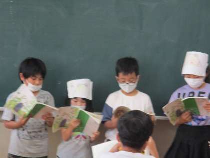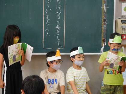 「お手紙」の音読げき発表会を行いました。少し緊張しながらも,自分で工夫した身振り手振りを付けたり,台詞によって体の向きを変えたりしながら,がまくんとかえるくんの気持ちにぴったりの音読をすることができました。がまくんとかえるさんの心温まるやりとりが伝わってきました。この学習を通して,学習を通して,音読をする際に大切にしたいことにたくさん気づけた子どもたちでした。登場人物の気持ちを考えて,音読に表現することに,これからも挑戦してほしいと思います。