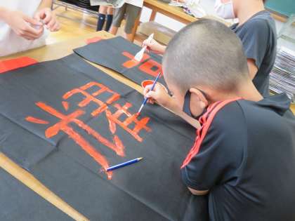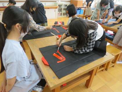 12日(火)に,表現運動で着る法被の背中に漢字を書きました。それぞれ自分の思いのこもった漢字を選んでいて,とても丁寧に仕上げていました。明日,14日(木)は,1組が書きます。