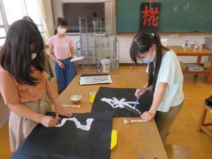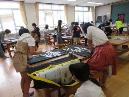 今日は1組が書きました。文字のデザインを考えて書く人や文字の周りにわざと絵の具をはねさせる人などたくさんの工夫が見られました。体育で着るのが楽しみです!