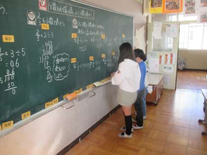 わり算の商を分数で表したり,分数を小数で表したりすることについて学習をしています。