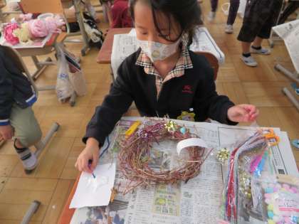 生活科の学習で育てたあさがおのつるを使ってリースを作りました。ゆめのもりで集めたどんぐりを飾るなど,すてきなリースができあがりました。