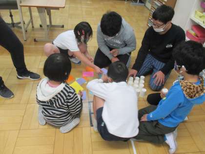小さな巨匠展合同作品作りに向けて,事前の交流会をリモートで行いました。お互いの自己紹介や”すきな○〇””冬休みにしたいこと”等をやりとりした後,紙コップ積みゲームを個人戦,小学校戦したり,ジングルベルを歌ったりしました。再来週の合同作品づくりが楽しみです。