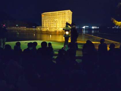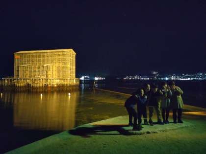 思ったほど寒くなく、子ども達は、ライトアップされた修理中の鳥居をバックに記念写真を撮りました。