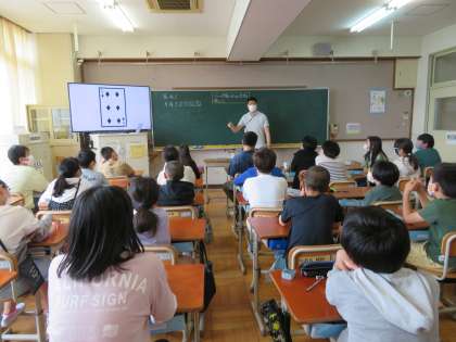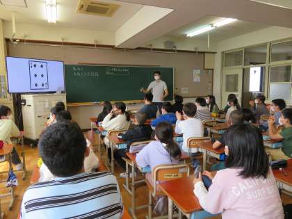 6年生の算数の学習は,井上先生が行います。「対称な図形」の学習では,共通点を探す学習から始めました。楽しそうに学習に参加する子どもたちの姿が見られています。