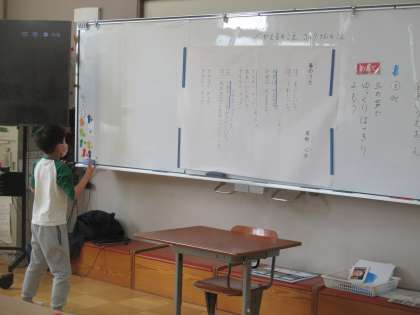 草野心平の春のうたの詩を味わいました。カエルの気持ちになった子供たちがそれぞれの考える,感じるカエルで発表しました。