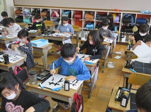 点画の筆使いに気をつけて,字形を整えて書きました。1組の子どもたちは,少し緊張している様子がうかがえましたが,集中して良い字が書けていました。
