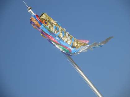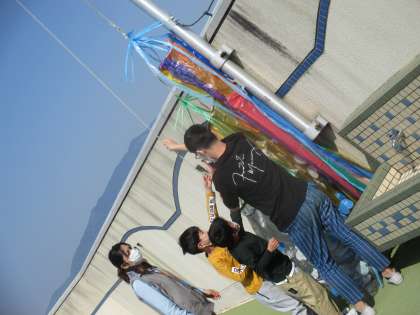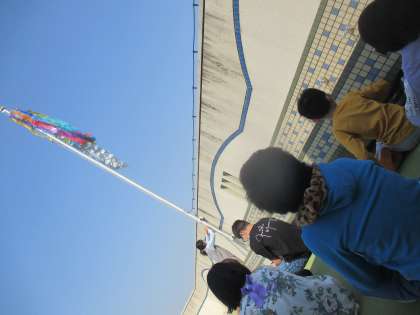 今年もなかよし学級と2年生でいっしょにこいのぼりを作りました。こいのぼりのうろこに夢やすきなことを書いてもらいました。快晴の下,二匹のこいのぼり”きんいろざかな”と”キラキラざかな”そして吹き流しが悠々と泳いでいます。晴れの日には毎日泳ぎますので,ご覧ください。