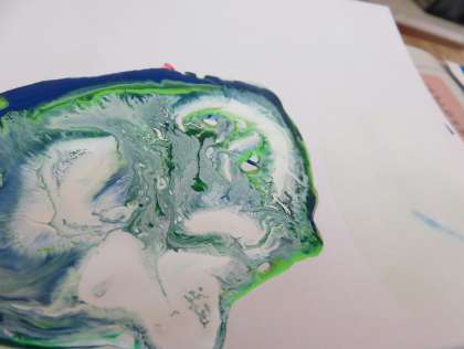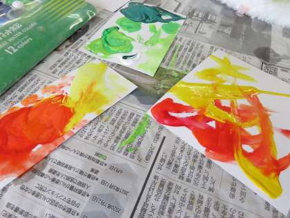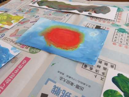 やってみると絵の具のまざり方や変わり方が,思わぬを作品に仕上がりました。子ども達も自分の作品や友達の作品を見ての驚きの声を上げていました。どの作品も表情豊かです。時間が経つにつれて変化していく作品もあり,絵の具が乾くまで楽しみです。