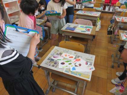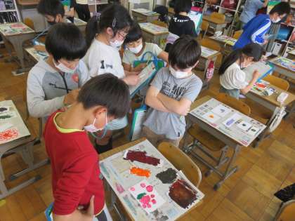 授業の最後には鑑賞の時間を取りました。鑑賞時間中は友達の作品の工夫を注意深く眺めることができました。きっと自分の作品作りを一生懸命取り組むことができていたからではないでしょうか。中には友達の作品を囲って,「この色はどうやって作ったのかな」「きっと…」と話し合う子ども達の姿も印象的でした。