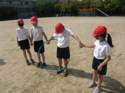 今回は友達と力を合わせてフープを端の人から端の人まで運びました。