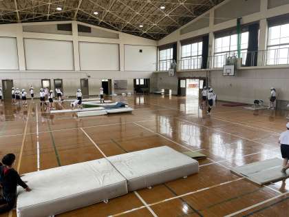 体育科の学習でマット運動をしています。これまでに習得した技を確認したり,新たに習得したい技をいろいろな場を使っています。