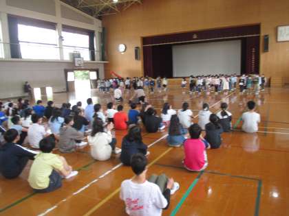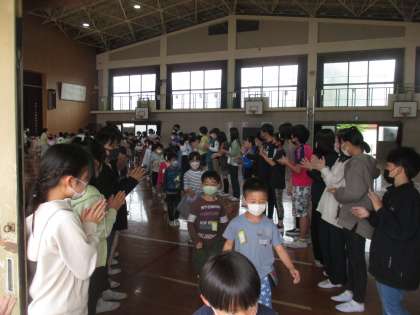 1年生からのメッセージを体育館で見て,その後花道を作って1年生を歓迎しました。