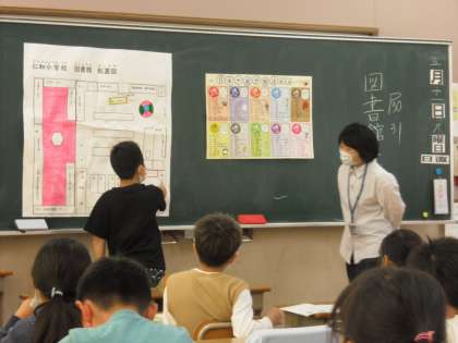 図書館のどのあたりにどのような本があるか,本に貼ってあるラベルはどういう意味なのかなどを学びました。