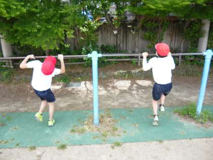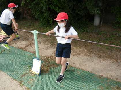 自分のできそうな技に挑戦しながら,「上がる技」「回る技」「下りる技」を組み合わせて練習しています。