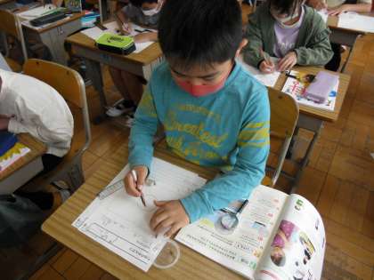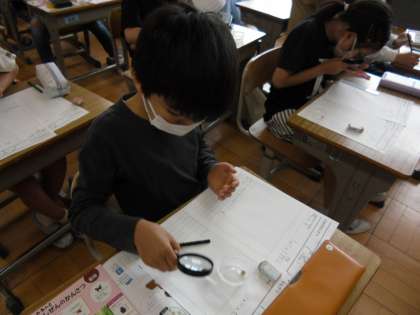 子どもたちは,虫めがねを使って注意深く観察をしていました。