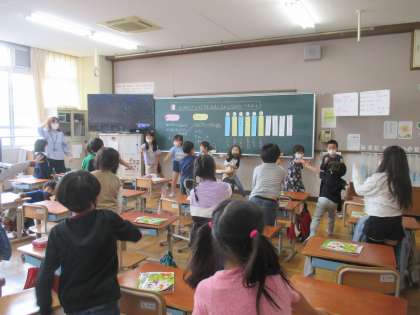 音楽の学習をしました。「かくれんぼ」という曲を様子を思い浮かべながら,体を使って楽しみました。