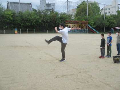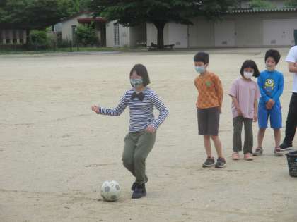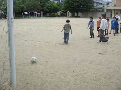 天気の良い日は,毎朝運動場で体を動かしています。サッカーボールが使えるのは,放課後だけなので,みんなでサッカーゴールにシュートをしてみました。