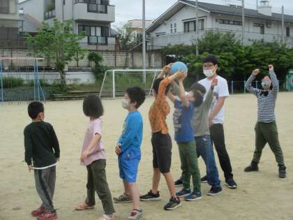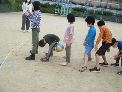 上・下 友達がとりやすいようにボールを送ります。久しぶりに挑戦しました。1年生は初めてだったけれど,上手にできました。
