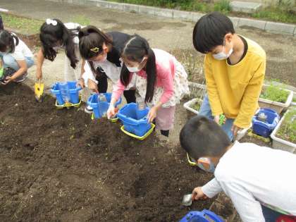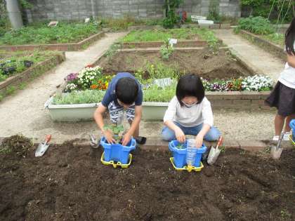 生活科の学習で,自分が選んだ野菜の苗を植えました。「収穫するのが楽しみだな」「毎朝の水やりもがんばる」と,これからの野菜の成長を楽しみにしている様子でした。