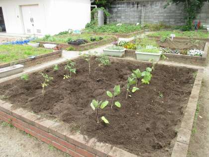 地域の方から頂いた野菜の苗も植えました。自分が選んだ野菜以外にも,色々な野菜に興味をもっている様子でした。様々な野菜の成長を見守っていきたいと思います。