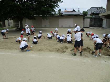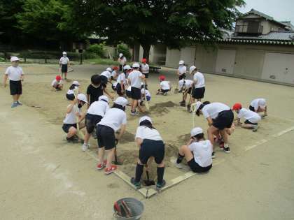 学習の前に,砂場の土をみんなで掘り返してふわふわにしました。