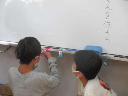 どんなものを作るか,子どもたちに見せた後に「名前はどうする。」と尋ねると,「どこでもくん。」と。できあがったどこでも君を教室のいろいろな所にぶら下げたり乗せたりして楽しんでいました。