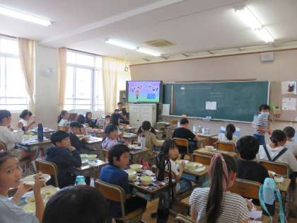 今日は「なごみ献立」でした。映像で食材について学んでいます。仁和小学校では,「給食室からこんにちは」というクイズプリントが毎日配布されます。子ども達が楽しみながら,食について学べるための取り組みです。
