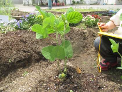 畑の夏野菜は,ほとんど緑色ですが,子どもたちは「薄い緑いろ」「きれいな緑色」等緑にもいろいろあると感じて色を塗っていました。ナスの観察では,ナスは葉からナスってわかる色をしていることも分かり,紫と緑で色を塗っていました。成長が楽しみです。