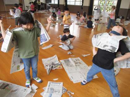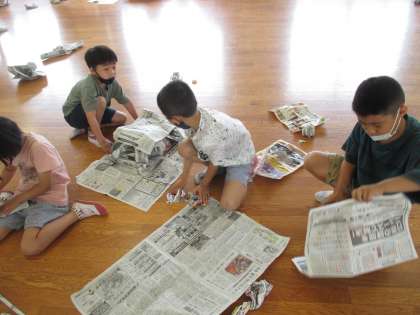 図画工作科「しんぶんしとなかよし」の学習をしました。新聞紙をならべたり,まるめたり,やぶったり,ねじったりして,思いついたものをつくりました。家,服,双眼鏡,食べ物などをつくり,楽しんでいました。