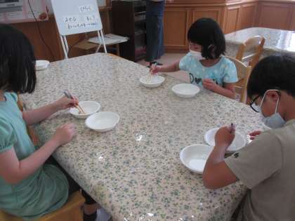 ランチルームは特別な空間のようで,子どもたちは先週予定表を受け取った時から楽しみにしていました。早田先生へのインタビューをした後,お箸の正しい使い方ということではがす・切る・つまむに挑戦しました。みんなとても上手です。今日の献立は,沖縄料理でした。おいしくいただきました。給食調理員さんを始め,お母さん,支えて下さる方々に感謝の気持ちでいただきました。