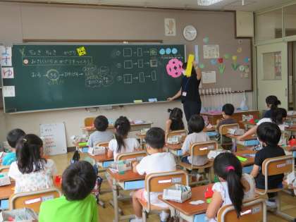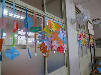 切った色紙をそっと開くと,面白い形ができました。「わぁ〜。すごい。」と子どもたちは大喜びでした。教室が素敵な飾りでいっぱいになりました。