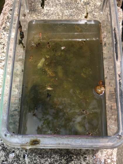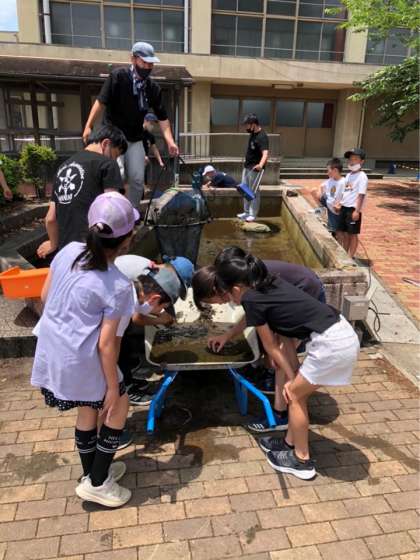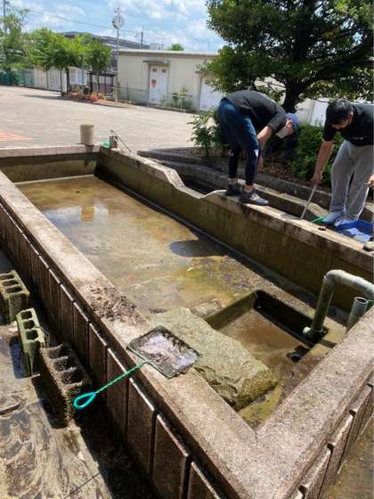 おやじの会のみなさんで体育館東側の池の水を抜き,掃除をしてもらいました。