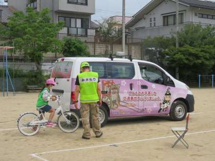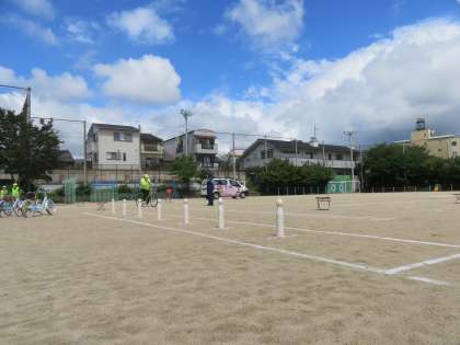 運動場で上京警察の方や地域の方に加えて,保護者の方にもご協力いただいて,実施しました。子ども達は緊張感を感じながらも楽しそうに自転車を運転していました。