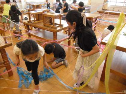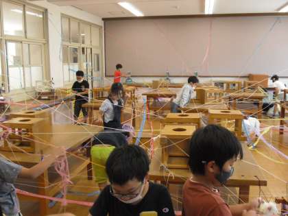 みんなで協力しながらひもをつなぎ,部屋の中がカラフルな世界になりました。