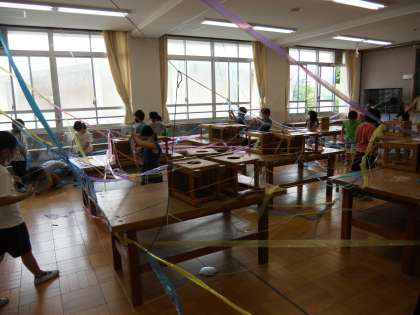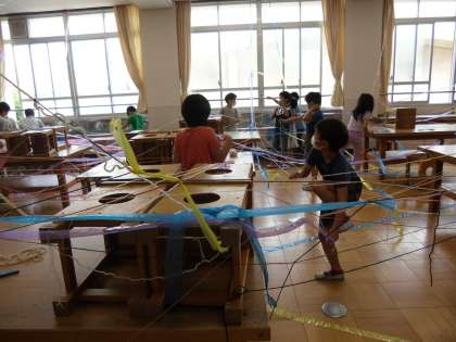 ひもとひもを結んでつなぐと,部屋の中がカラフルな世界になりました。