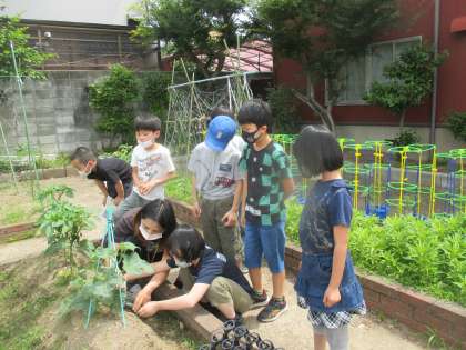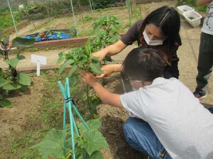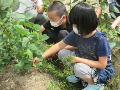 雨がしっかり降ると,野菜も育つけれど雑草も育ちます。自分が観察担当する野菜の周りの草を取り,今日は,収穫もしました。先週収穫をがまんしたきゅうりがどれくらいの大きさになっているのか,予想してから収穫しました。22cmと予想した友達が予想的中。太くきれいな緑色のキュウリやちょっと小ぶりの千両ナス,細めのピーマン,ちょっぴりひび割れのミニトマトが取れました。