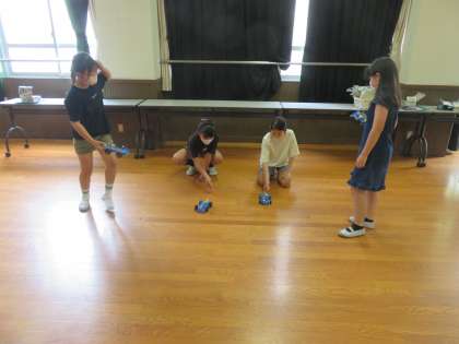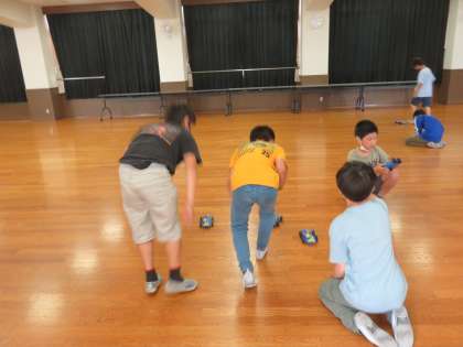 今日は,今まで学習したことを活用して車をつくりました。「回路が完成しているか」を注意深く確認しながら組み立てました。写真は,ゆめホールで勢いよく走る車を見て嬉しそうに歓声をあげる子ども達の様子です。