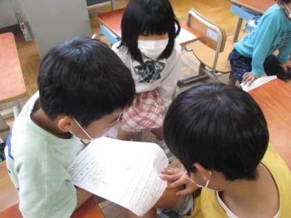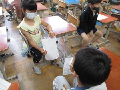 国語科「かんさつ名人になろう」の学習で,書いたかんさつカードをもとに友だちと交流しました。