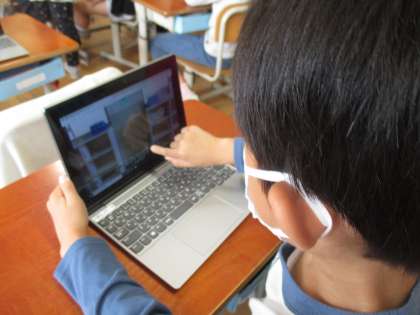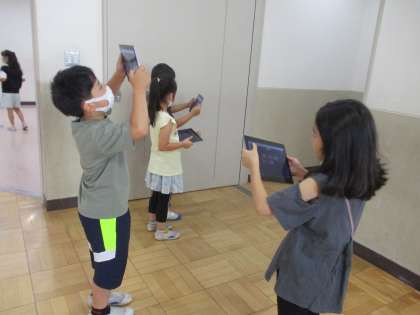 図画工作科「ともだち見つけた」の学習をしました。身の回りをよく見て,隠れている友達を探して,写真を撮りました。「ドアの持つところが目に見える」「天井の模様が顔に見える」と言いながら,たくさん見つけていました。撮った写真はロイロノートで提出し,交流しました。
